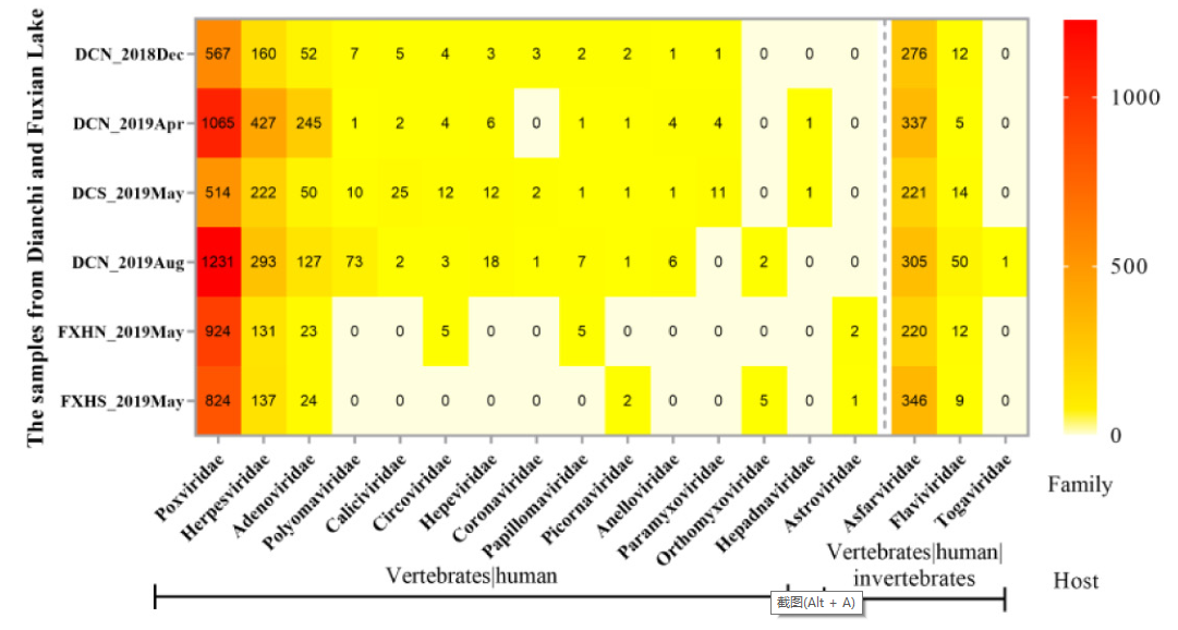 图2 滇池和抚仙湖中人类病毒科的丰度